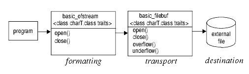 There are functions for opening and closing files, similar to the C functions fopen() and fclose(). Internally they use a special kind of stream buffer, called a file buffer, to control the transport of characters to/from the associated file. The function of the file streams is illustrated in Figure 24: