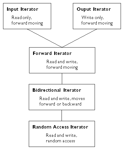 Iterators are a generalization of pointers that allow a C++ program to uniformly interact with different data structures. The illustration below displays the five iterator categories defined by the standard library, and shows their hierarchical relationship. Because standard library iterator categories are hierarchical, each category includes all the requirements of the categories above it.
