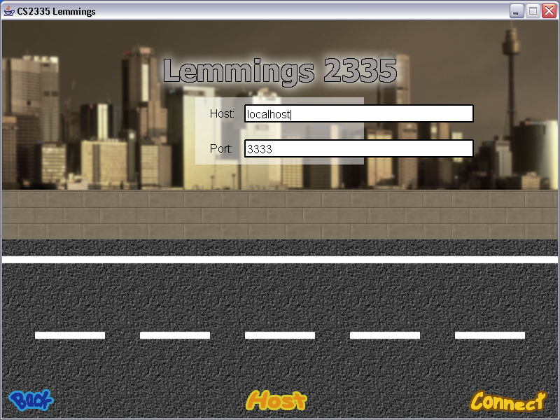 After the start of Lemmings program,a Main Menu will be presented to the user.Once the users clicks Multiplayer Game button from the Main Menu, he will be presented with an option to host or connect to the server.